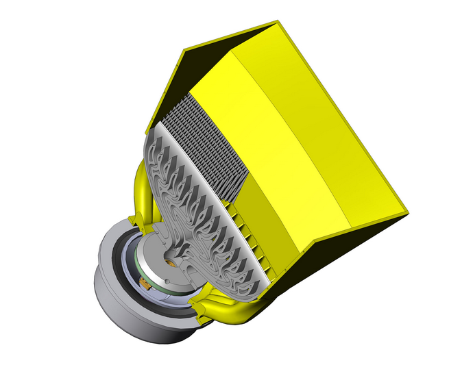 弯曲阵列音箱技术的核心是它位于中央的可旋转的中/高音部分,它不仅可提供优越的性能,而且具备超群的灵活性。高音和中高音驱动单元为保持小尺寸而做同轴组装,箱体设计精巧细密。驱动单元分别用一个的树枝状高频号角Dendritic™和一个中频多号角Polyhorn™组装在一个组合式的波导内,两者使用相同的声学原理:从振膜到号角口相等的波导管路径长度保证在号角口产生相同相位的波阵面。