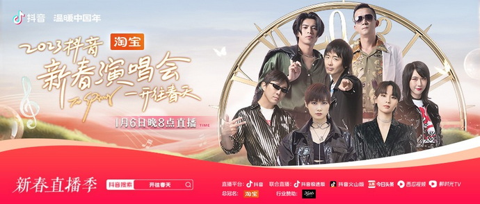 2023年1月6日,由淘宝冠名的「抖音新春演唱会——开往春天」晚8点准时开启直播。本次抖音新春演唱会阵容强大,汇聚了众多超强音乐人阵容,如李宇春、周笔畅、新裤子乐队和五条人乐队,共同献上一场精彩绝伦的音乐演唱会,与大家一起乘上开往春天的音乐列车,迎来充满能量的2023!