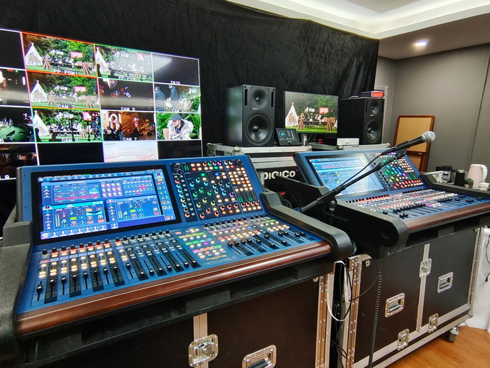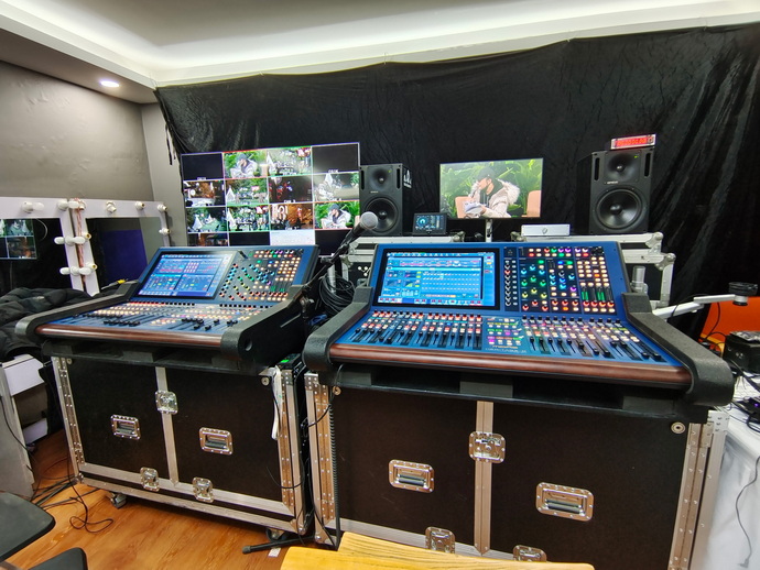 此次演唱会的音响系统由MaxTeam团队负责,邵勇老师作为音响总设计。为了满足现场音响的需求,本次的数字调音台系统,共使用了3张MIDAS HD96-24调音台:其中2张HD96-24用于OB线上直播,调音师由杜一超老师担任;1张HD96-24用于舞台监听,调音师由王虎老师担任。此外,PA部分的调音台则采用MIDAS M32 LIVE,内通系统也是由M32R LIVE负责。这些音响设备均由北京KOI音乐中心的周晓飞提供。